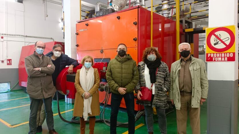 En la foto, Mónica Pedreira (DFG) con representantes de Urberoa (Gerencia y Consejo Rector) y Giroa-Veolia, en la sala de calderas de Urberoa.